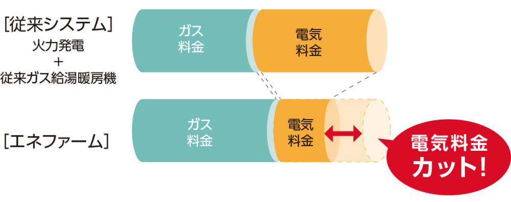 自宅で発電することにより電力会社からの電力購入量を減らすことができます。発電にガスを使用する分で増えたガス量は、エネファーム用のお得なガス料金プランにすることによって、トータル光熱費を抑えることが可能です。